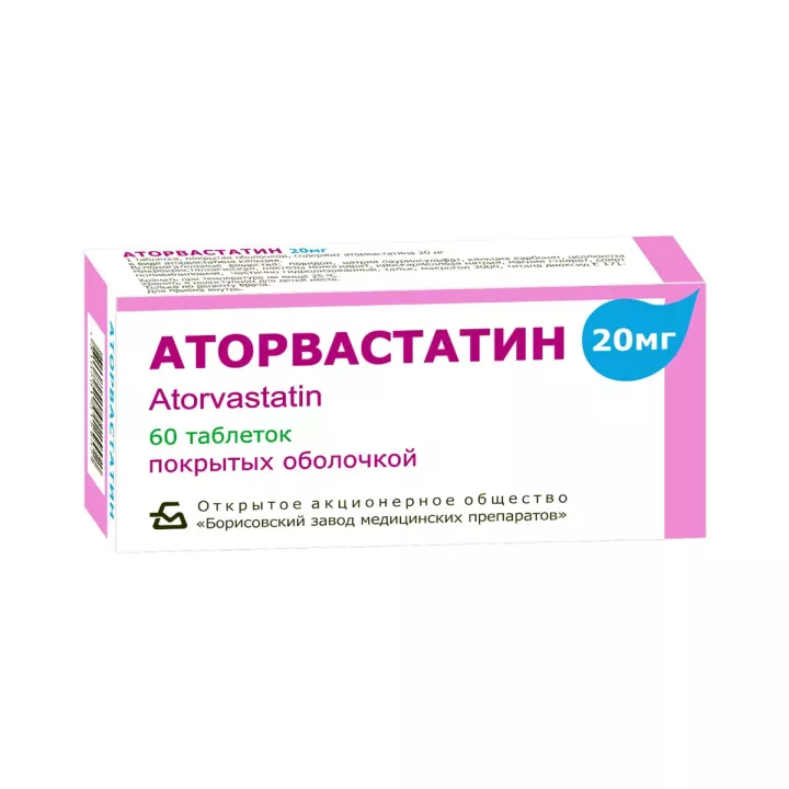 Аторвастатин 20 мг таблетки покрытые пленочной оболочкой 60 шт
