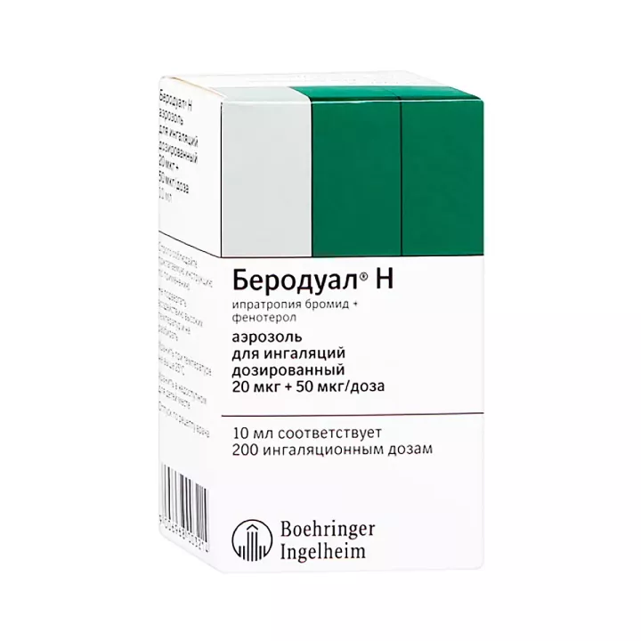 Беродуал Н 20 мкг+50 мкг/доза аэрозоль для ингаляций дозированный 10 мл флакон 200 доз