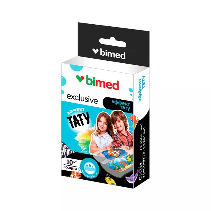 Бимед Exclusive пластырь влагостойкий пористый прозрачный с рисунком (эффект тату) ассорти 10 шт