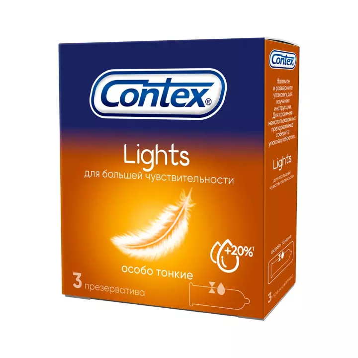 Презервативы Сontex® Lights 3 шт. - гладкие, тонкие. 3 особо тонких презервативов Contex Lights (Лайтс) в силиконовой смазке для большей чувствительности. Бесцветные, прямой формы, с накопителем. Номинальные размеры: длина – 180 мм, ширина – 52 мм. Смазка не разрушает сперматозоиды. Изготовлены из натурального латекса. Проверено электроникой. Только для одноразового использования.