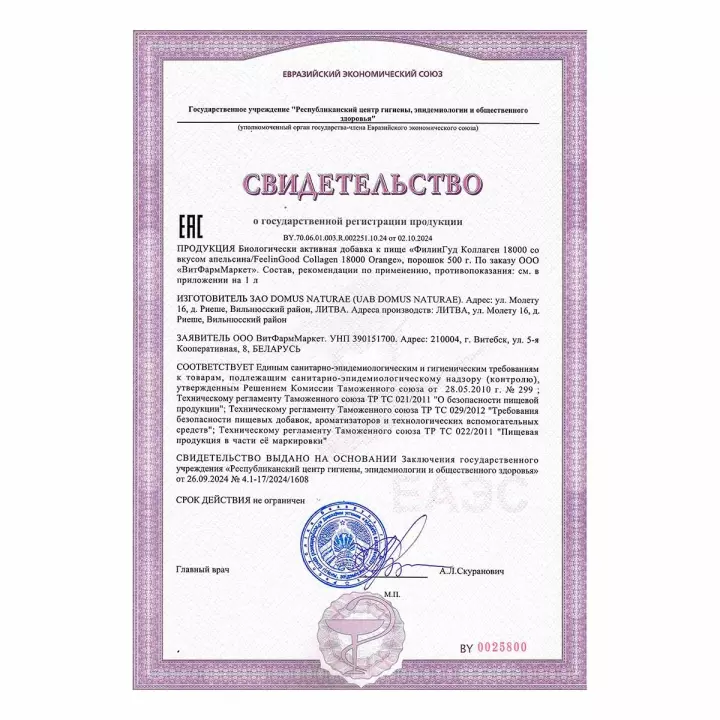 | Торговое наименование | ФилинГуд Коллаген 18000 со вкусом апельсина |