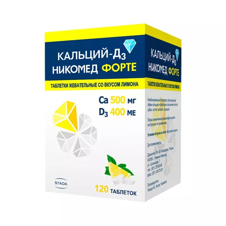 Кальций-Д3 Никомед Форте лимон 500 мг+400 МЕ таблетки жевательные 120 шт