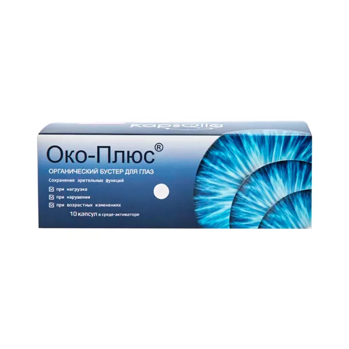 KapsОila Око-Плюс – органический липофильный бустер на основе нативной формулы биологически активных антоцианов плодов черники, штаммов-продуцентов Blakeslea trispora, лютеолина, плодов люцерны в среде-активаторе бета-каротиноидов и омега-3, омега-6 жирных кислот, обогащённой аминокислотным и антиоксидантным комплексом.