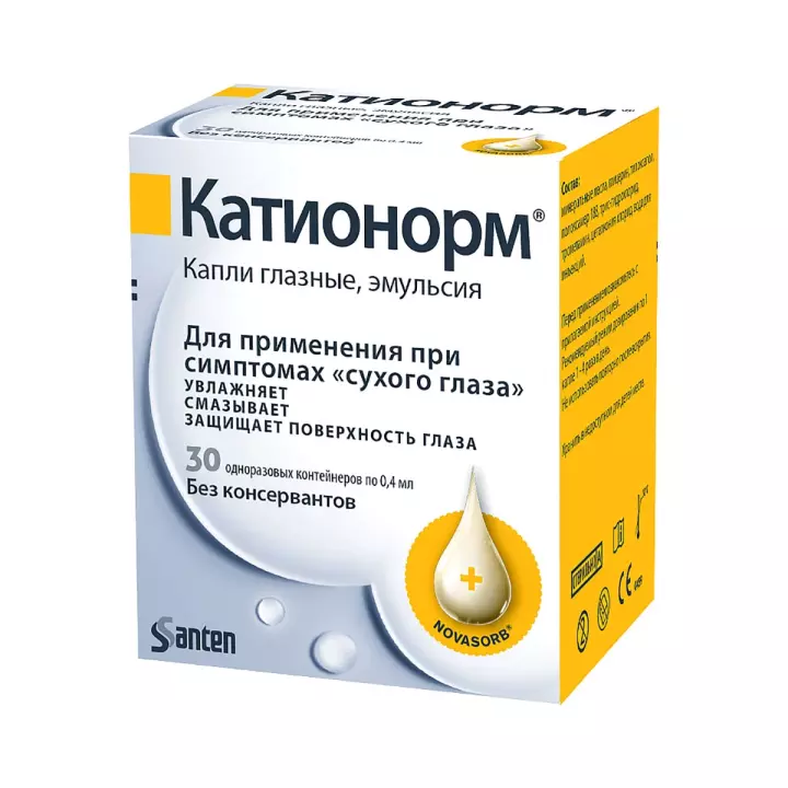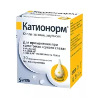 Катионорм – это офтальмологическая стерильная гипотоническая эмульсия для глаз в виде жидкости молочного цвета, не содержащая консервантов. Катионорм предназначен для устранения симптомов «сухого глаза», проявляющихся в виде покалывания, зуда, жжения или ощущения инородного тела в глазу (песка или пыли). Данные симптомы могут быть вызваны внешними факторами (такими как работа