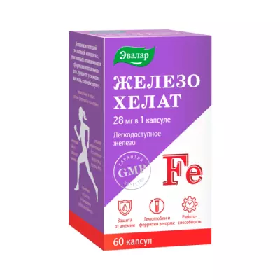 Железо (бисглицинат), агент антислеживающий Е460i микрокристаллическая целлюлоза, мальтодекстрин, витамин C (L-аскорбиновая кислота), агент антислеживающий Е470b магневые соли жирных кислот, витамин B6 (пиридоксин гидрохлорид), птероилмоноглутаминовая кислота – фолат, витамин B12 (цианокобаламин), капсула (желатин, краситель: Е171 диоксид титана).