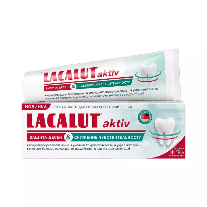Зубная паста Lacalut Aktiv предназначена для комплексного решения проблем чувствительности зубов и состояния дёсен. Её формула обеспечивает укрепление дёсен, снижение их кровоточивости и уменьшение гиперестезии (повышенной чувствительности к температурным, химическим и механическим раздражителям). Активные компоненты оказывают антисептическое, противовоспалительное и реминерализующее действие.