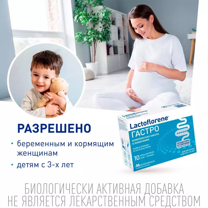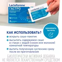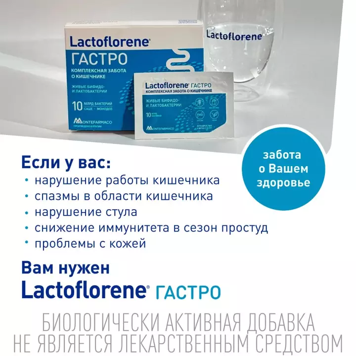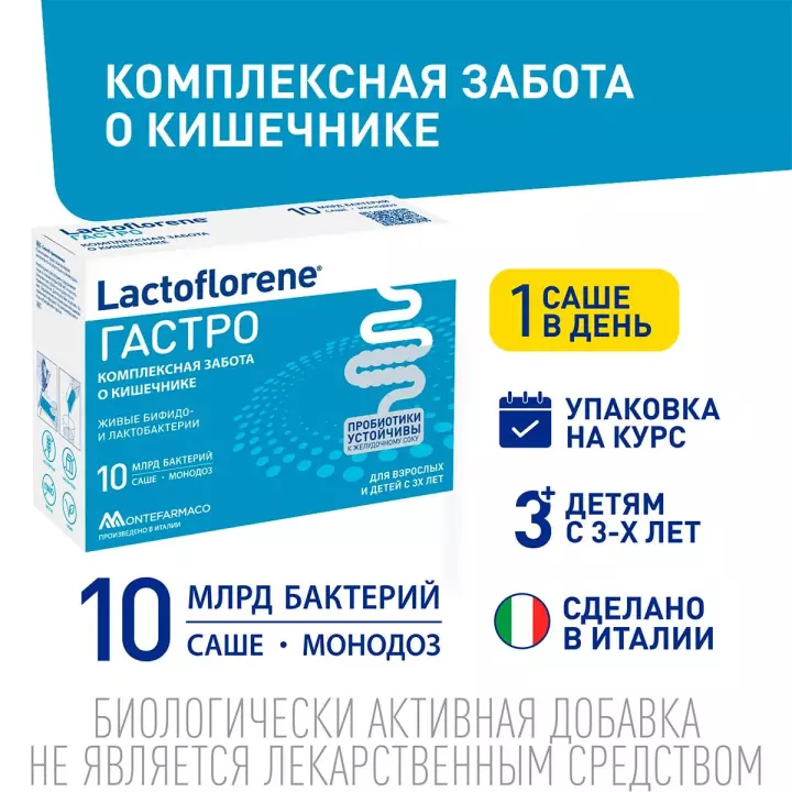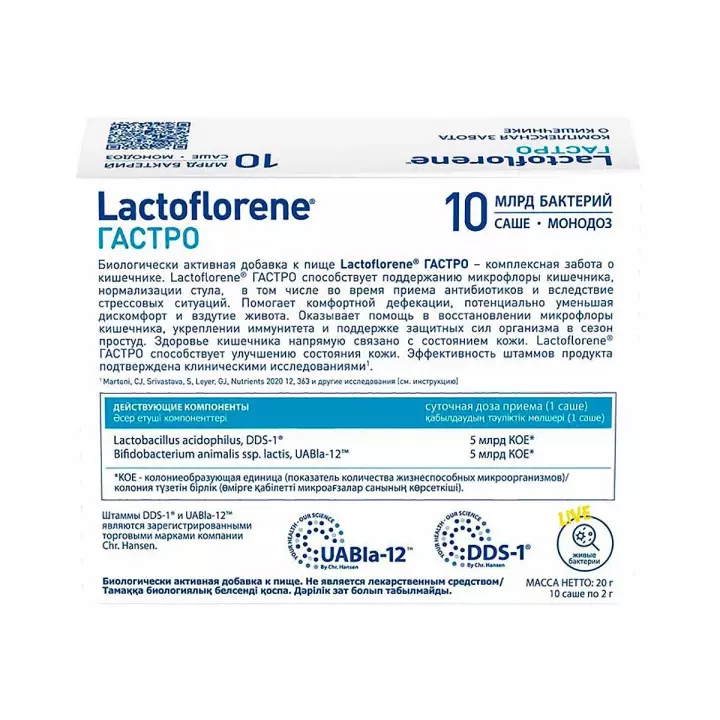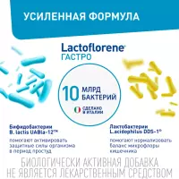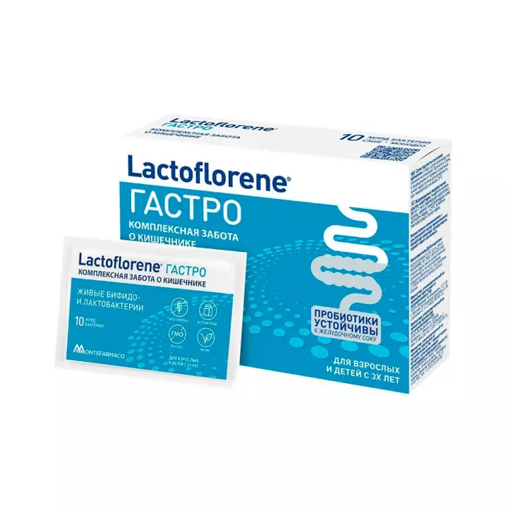 Lactoflorene Гастро – пробиотический комплекс способствует поддержанию микрофлоры кишечника, помогает нормализации стула, оказывает помощь в укреплении респираторного здоровья в сезон простуд и способствует улучшению состояния кожи. Пробиотические штаммы DDS-1® и UABla-12™, входящие в состав Lаctoflorene Гастро, устойчивы к кислой среде желудка, что обеспечивает их максимальную колонизацию и помощь в комплексной заботе о кишечнике.
