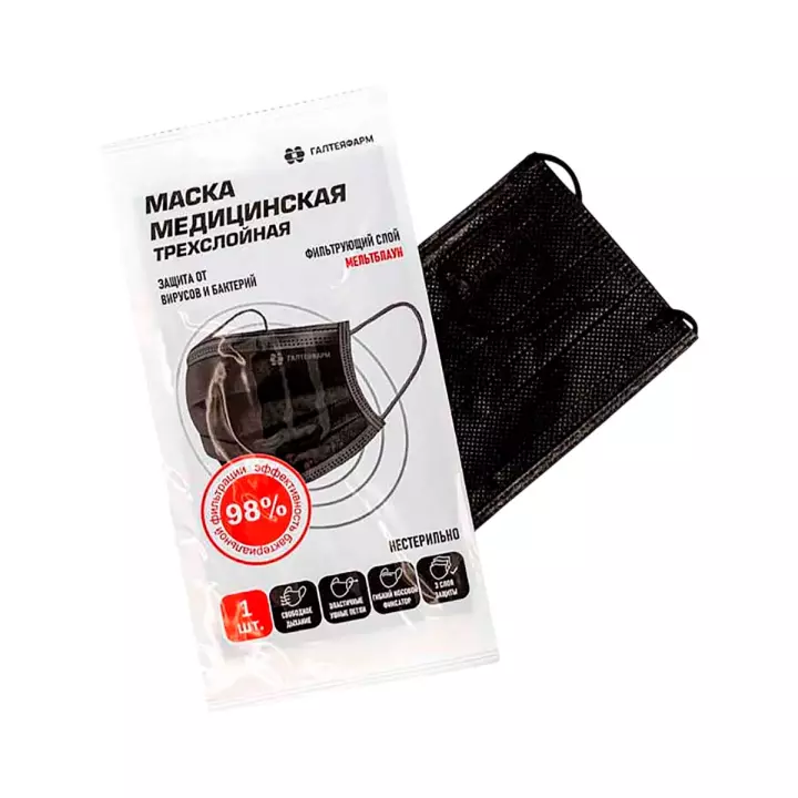 Маска медицинская 3-слойная нестерильная однократного применения тип II на резинках черного цвета 17,5х9,5 см 1 шт Галтеяфарм