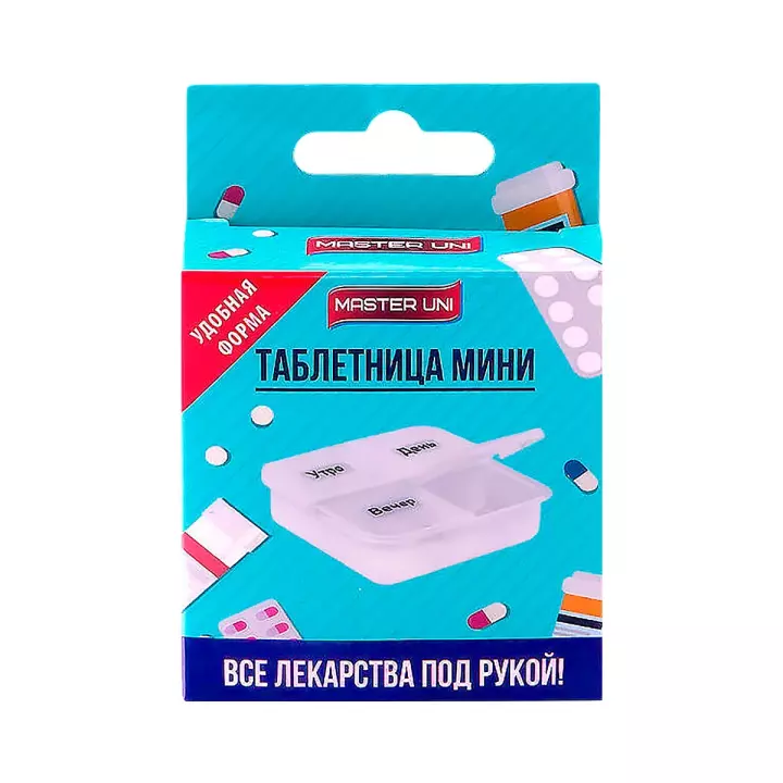 Master Uni таблетница Мини - 4 ячейки, подписанные в соответствии с суточным режимом приема лекарств. Каждая ячейка оснащена индивидуальной крышкой из прочного пищевого пластика, что делает ее безопасной и практичной в использовании.