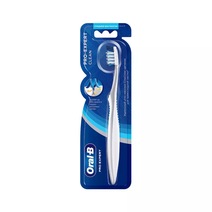 Мануальная зубная щетка Oral-B Pro-Expert Clean удаляет до 99% налета в труднодоступных местах. Идеальный угол наклона щетинок и технология CrissCross превосходно очищают, глубоко проникают в пространства между зубами и удаляют налет в труднодоступных местах. Поверхность для чистки языка на обратной стороне головки щётки. Щетинки средней жесткости.