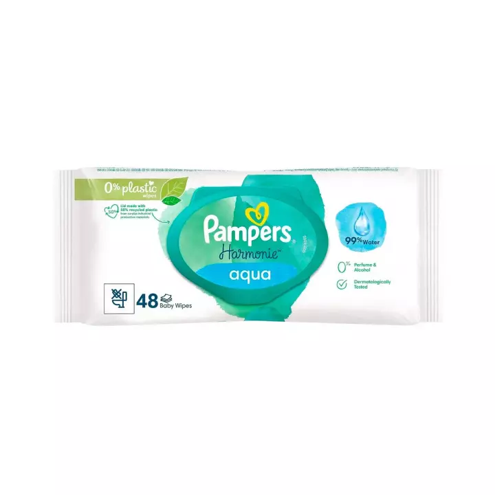 Салфетки влажные детские Pampers Harmonie Aqua с органическим хлопком. Содержат 99% чистой воды, помогая обеспечить защиту нежной кожи вашего ребенка. В составе нет спирта и отдушек. Оставшийся 1% — это прошедшие дерматологические испытания мягкие очищающие вещества и проверенные Pampers ингредиенты, которые помогают поддерживать баланс рН и защищать кожу малыша от раздражения. Влажные салфетки Aqua Harmonie безопасны для нежной кожи новорожденного.