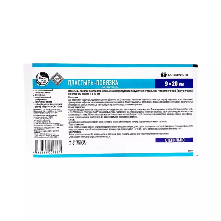 Пластырь-повязка послеоперационный с абсорбирующей подушечкой стерильный гипоаллергенный (хирургический) на нетканой основе 9х20 см 1 шт Галтеяфарм