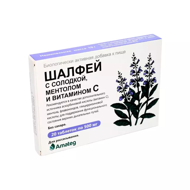 Шалфей с солодкой, ментолом и витамином С таблетки 500 мг 20 шт Amateg