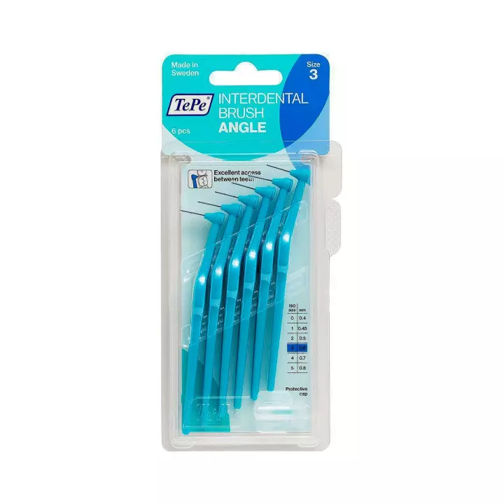 TePe Angle - это ершики с длинной ручкой и наклонной головкой для более легкого доступа между задними зубами. Спиралька ершика упруга к сгибанию, покрыта специальным медицинским силиконом (не травмируются десна и эмаль). Ворсинки сделаны из полиамидной нити (хирургический шовный, невпитывающий материал, не стирает эмаль и десну, налет с ворсинок легко смывается водой). Межзубные ершики TePe Angle №3 с диаметром проволки 0,6 мм предназначены для чистки брекетов, имплантов, зубных мостов, коронок, мест где отсутствует зуб.