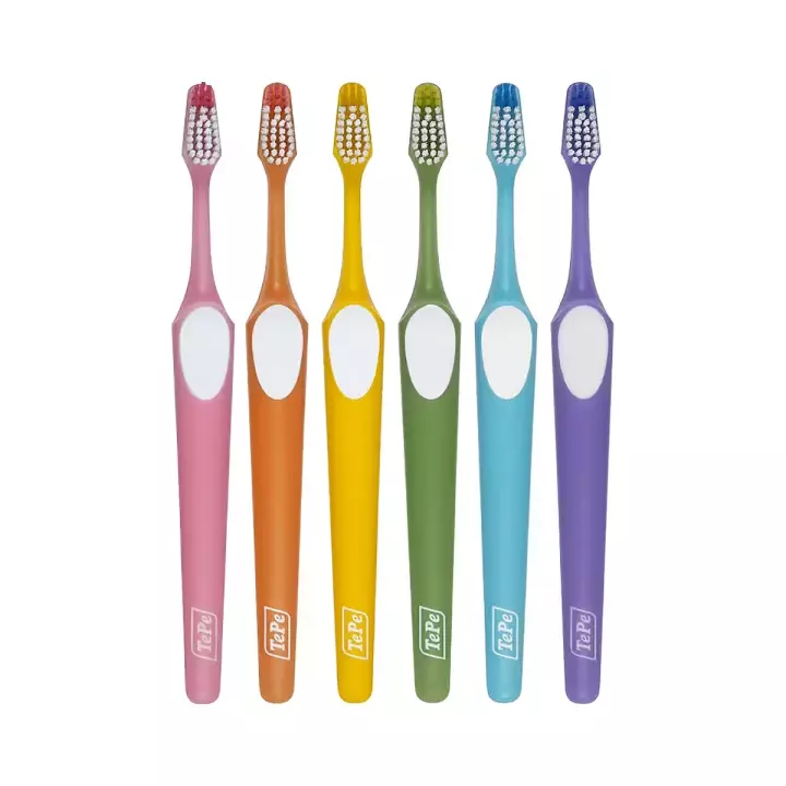 Зубная щетка средней жесткости TePe Nova Medium с активным пиком для лучшего доступа к молярам и при скученности зубов, с упором на ручке для большого пальца. Конические головки щеток обеспечивают лучший доступ в труднодоступные места.