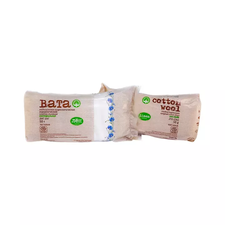 Вата медицинская гигроскопическая хирургическая хлопко-льняная нестерильная 50 г лента зиг-заг 1 шт Медватфарм
