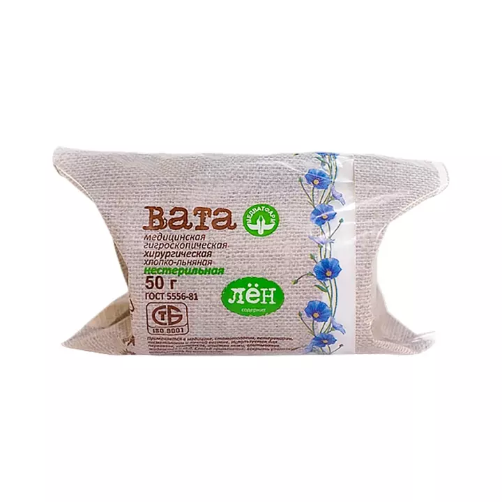 Вата медицинская гигроскопическая хирургическая хлопко-льняная нестерильная 50 г рулон 1 шт Медватфарм