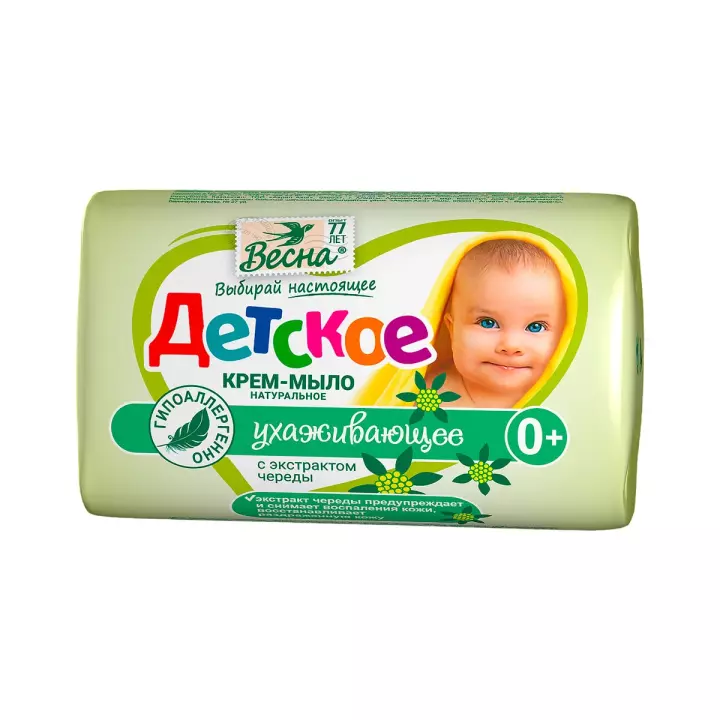 Крем-мыло твердое детское с экстрактом череды "Ухаживающее" - незаменимое средство для ежедневного ухода за чувствительной кожей малыша. Гипоаллергенная формула способствует мягкому очищению, экстракт череды предупреждает и снимает воспаления кожи, восстанавливает ее.