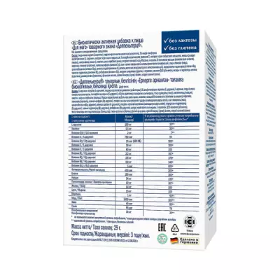 Е460, L-карнитина L-тартрат, L-таурин, аскорбиновая кислота, Е470, витамины А, Е, витамины группы В (В1, В2, В3 (РР), В6, В12, пантотеновая кислота, фолиевая кислота, цинк, селен, медь, йод, Е464, Е1521,Е171,Е172.