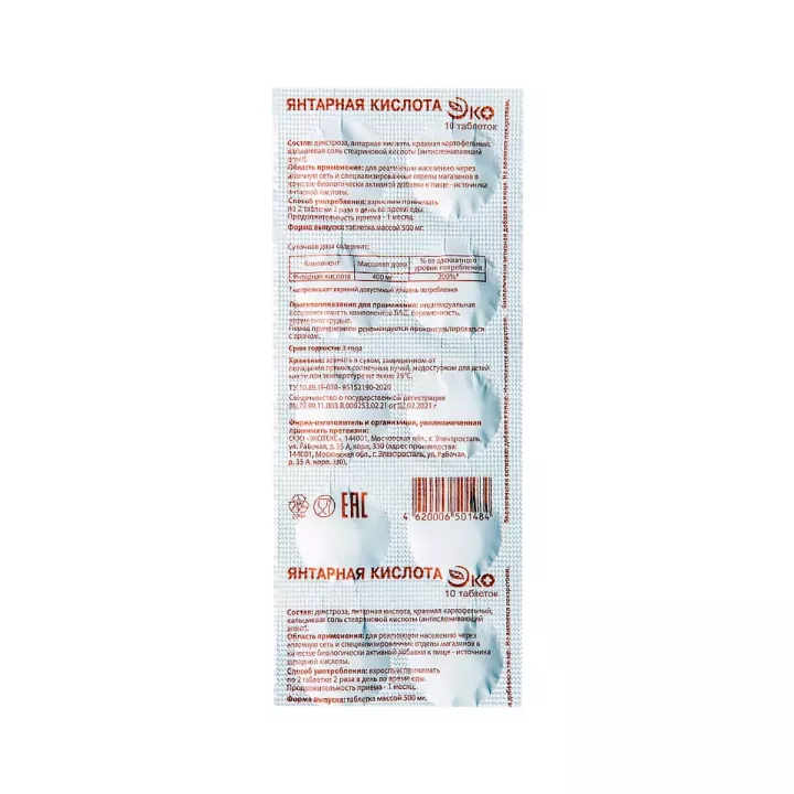 Янтарная кислота ЭКО таблетки 500 мг 10 шт
